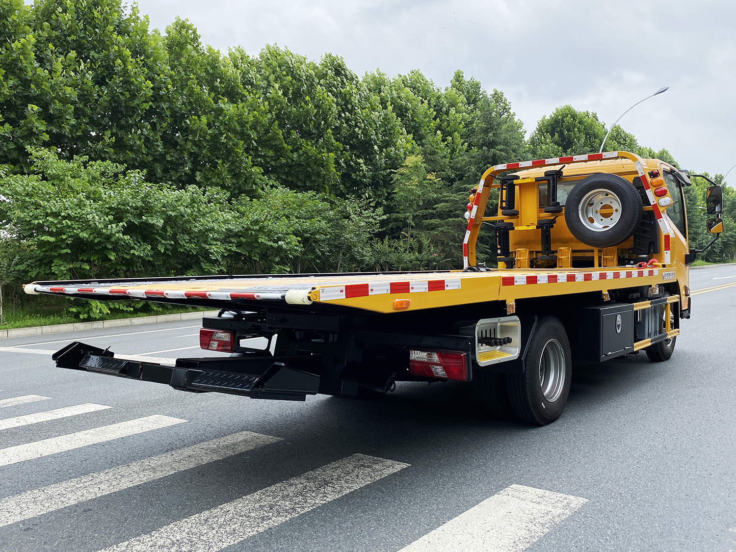 上装配置:蓝牌冲压平板一体板,板长5350,带一个活动尾板;双侧联动操作装置,后工作灯三只,1个40KN绞盘(配25米钢丝绳),1个工具箱,配2个小车,1对L型抱胎架,4根插绑带,1对托叉及托叉座,1条链钩,配2吨后托臂。